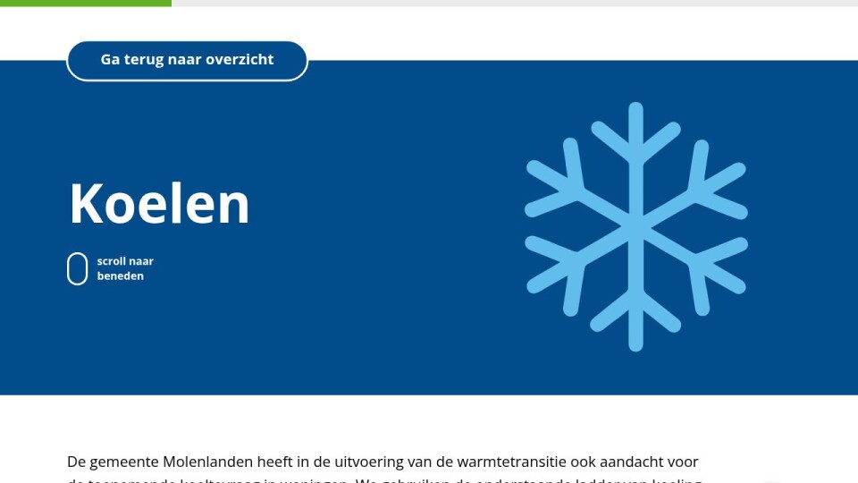 De gemeente Molenlanden heeft in de uitvoering van de warmtetransitie ook aandacht voor de toenemende koeltevraag in woningen. We gebruiken de onderstaande ladder van koeling in advies en eigen acties: