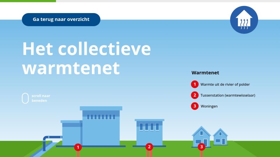 Een warmtenet is een netwerk van leidingen onder de grond waar warm water doorheen stroomt. Dit warme water verwarmt meerdere huizen en gebouwen, zonder dat je een cv-ketel of gas nodig hebt. De warmte komt uit een centrale bron, bijvoorbeeld restwarmte van een groot bedrijf of warmte uit de rivier.