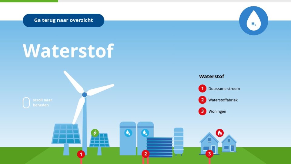 Waterstof is een gas waarmee je je huis verwarmen, net als met aardgas. Het grote verschil: bij verbranding van groene waterstof komt geen CO₂ vrij. Duurzame waterstof wordt gemaakt met behulp van duurzaam opgewekte stroom.